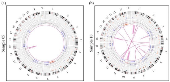 Circos plots showing 2 examples of hyperdiploid genomes. (a) Sample 05 represents a hyperdiploid genome (absence of an IGH translocation) showing numerous SVs and CNVs including gains of 6 classic odd-numbered chromosomes (3, 5, 9, 11, 15 and 19). Sample 05 also shows an intrachromosomal translocation call by the software, which represents an interstitial deletion of the long arm of chromosome 14. (b) Sample 18 shows a much more complex case of hyperdiploidy (absence of an IGH rearrangement) with gains of chromosomes 3, 5, 7, 9, 11, 15 and 21 in addition to many more SVs and CNVs. This sample also shows 13 intrachromosomal translocations and 18 interchromosomal translocations. Aneuploidies are represented by blue (gains) and orange (losses) lines in the inner circle and translocations are represented by pink lines in the center. The colored dots in the outer circle represent SVs (deletions, inversions, duplications, insertions).