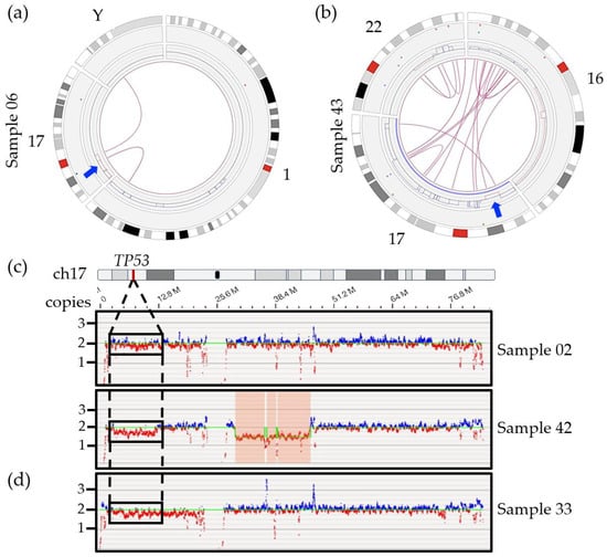 Circos plots of specific chromosomes involved in SVs with chromosome 17 and TP53 genomic region for two samples. (a) Sample 06 revealed two interchromosomal translocations involving the short arm of chromosome 17, chromosome Y and chromosome 1, leading to loss of sequence (red lines) surrounding the breakpoint. The arrow indicates localization of the TP53 gene. (b) Sample 43 showing an intrachromosomal translocation call targeting chromosomal bands 17p13.1 and 17q25.5 right next to the deletion region including the TP53 gene (arrow). Multiple interchromosomal translocations involving chromosomes 16 and 22 also lead to several gains (blue lines) and losses (red lines) on those chromosomes. (c) Whole genome view of chromosome 17 for samples 02 (6% by FISH), 42 (45% by FISH) without any deletion call using recommended CNV filter. As opposed to the 17q region which shows both blue and red signals, the absence of blue signals and predominance of red signals correlates with a potential lower copy number for the TP53 region in those samples. (d) Non-diploid sample 33, with 2 and 3 copies of TP53 by FISH, showing a potential deletion of 17p and potential false positive call.