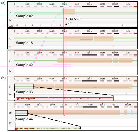 Genome browser view in Access of the short arm of chromosome 1 from the telomere to the centromere. (a) Targeted 1p/CDKN2C deletion calls for samples 02, 18 and 42 are indicated in red boxes on the copy number (CN) track with a concurrent change in the copy number (green line). The vertical red rectangle indicates the localization of the CDKN2C gene, at chromosomal band 1p32.3. (b) Larger 1p/CDKN2C deletion calls for sample 33 and 44 marked in red on the CN track. Sequences located on the telomeric end of chromosome 1p are zoomed in (black rectangle), showing a potential loss of sequences by visual inspection.