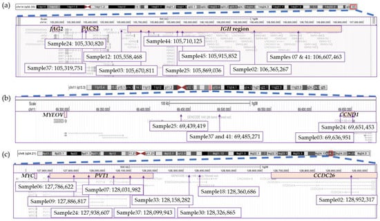 Breakpoints for structural variations involving the (a) IGH region on chromosome 14, (b) CCND1 region on chromosome 11 and (c) MYC region on chromosome 8. This figure was modified from screenshots of the hg38 genome taken from the UCSC Genome Browser (http://genome.ucsc.edu (accessed on 9 June 2023)) [62].