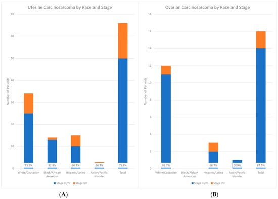 The majority of patients were diagnosed with advanced-stage disease at the time of presentation. At the time of their diagnosis, 50 patients with UCS (76%) and 14 patients with OCS (88%) had stage III or IV disease. The single case of CCS was stage II at diagnosis. When considering race/ethnicity, patients self-identifying as minorities (Black/African American, Hispanic/Latina, and Asian/Pacific Islander) with uterine carcinosarcoma were more likely to present with advanced-stage disease (stage III/IV) (p < 0.0001, df = 24). This difference was largely driven by the number of Black/African American patients presenting with advanced-stage disease: 93% of Black/African American patients, 74% of White patients (25/34), 67% of Hispanic/Latina patients, and 67% of Asian/Pacific Islander patients with UCS presented with advanced stage disease (Figure 1A). A total of 100% of Asian/Pacific Islander patients, 92% of White patients, and 67% of Hispanic/Latina patients with OCS presented with advanced-stage disease (Figure 1B). Figure 2 depicts the comparison of women with uterine carcinosarcoma presenting with late-stage (III/IV) versus early-stage (I/II) disease.