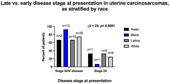 Early- vs. late-stage distribution upon presentation of patients with uterine carcinosarcoma, as stratified by the patients’ race. The bars represent percentages of Asian, Black, Latina, or White patients presenting at certain stages. Data were analyzed with chi-square test. Total number of uterine carcinosarcoma patients in this cohort is 66.