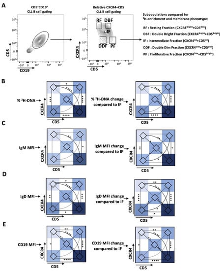 Intraclonal variability for all parameters studied (e.g., IG densities and 2H-DNA) was evaluated concomitantly in two ways: [1] by comparing absolute values of various fractions (e.g., MFI and 2H-DNA), or [2] fraction change with respect to the IF for 2H-DNA incorporation and the CXCR4/CD5 phenotype or with respect to Int for mIg density, as in (X-IF or Int)/IF or Int with X = any fraction; in this way, Int = 0 and values > or < 0 for increased or decreased values, respectively. Data are presented as graph bars for all subpopulations. For CXCR4/CD5 and IGs intraclonal fractions, graph bars are paired with heatmaps, ranging from light blue (lowest value) to dark blue (highest value). Statistical analyses were performed using GraphPad software v7 and v8. For all comparisons, one-way ANOVA and Fisher’s LSD tests were used. The p-values are reported as follows: not significant, ns (p > 0.05); * p ≤ 0.05; ** p ≤ 0.01; *** p ≤ 0.001; and **** p ≤ 0.0001.