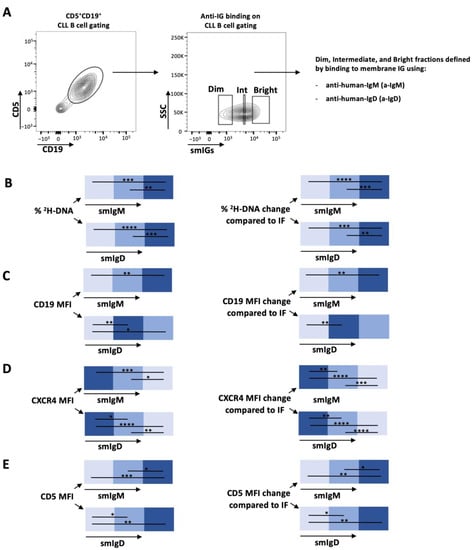 Comparison of smIgM and smIgD densities during transition from the PF to the RF in the CXCR4/CD5 densities: BCR signaling is key in CLL pathogenesis, as evidenced by the effectiveness of drugs blocking this pathway [7,25]. Additionally, CLL smIgM and smIgD differ in their functional roles and clinical correlations [15,16]. Therefore, we measured intraclonal variability in smIgM and smIgD densities in the five CXCR4/CD5 fractions of interest. Cells with the highest levels of both smIgM and smIgD were found in the PF, and these were significantly greater than the IF, DBF, and RF. Additionally, the PF cells had a greater density than the DDF for IgD only, and smIgD densities differed the most between the DBF and the RF. Thus, smIgM densities follow this order, PF = DDF > IF = DBF = RF, whereas, for smIgD, PF > DDF > IF = DBF > RF (Figure 1C,D and Supplementary Figure S2B,C). In general, the distribution of different smIG densities resembles those seen for 2H-DNA incorporation (Figure 1 and Supplementary Figure S2).