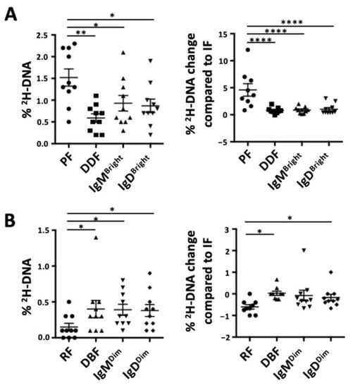 In addition, CLL B cells (CD5+CD19+) were sorted from the same cryopreserved cells into 3 fractions based on the densities of membrane sIgM and sIgD (smIgMDim, smIgMInt, smIgMBright, smIgDDim, smIgDInt, and smIgDBright). These fractions were also compared for their levels of 2H enrichment. Refer to the Supplementary Materials and Methods for further details [1,24].