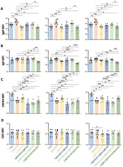 Comparisons of the effects on surface membrane amount of IgM, IgD, CXCR4, and CD5 on CLL cells after stimulation in vitro by TLR9 or anti-IGs, either alone or in combination, with the latter delivered at different time points. For each graph, the effects on MFI levels from the stimulation of the following receptors are represented: (i) control (Ctrl, light blue); (ii) TLR9 at day 0 (CpG+IL15, red); (iii) smIGs at day 0 (a-IGs+IL4, yellow); (iv) TLR9 and smIGs at day 0 (CpG+IL15+a-IGs+IL4, dark blue); (v) TLR9 at day 0 and smIGs at day 3 (CpG+IL15 and a-IGs+IL4, light green); and (vi) smIGs at day 0 and TLR9 at day 3 (a-IGs+IL4 and CpG+IL15, dark green). For each row, the TLR9 stimulation is represented in combination with anti-IgM (left), anti-IgD (middle), and anti-IgM + anti-IgD (right). The MFI changes in the various parameters were compared for the different stimulations for (A) IgM, (B) IgD, (C) CXCR4, and (D) CD5. Nonsignificant p-value (p > 0.05) is shown as blank; significant p-value is reported as * p ≤ 0.05, ** p ≤ 0.01, *** p ≤ 0.001, and **** p ≤ 0.0001.