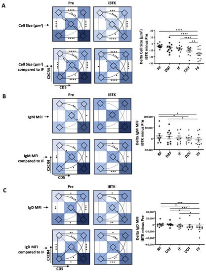 Changes in CLL cell size and smIG density of the CXCR4/CD5 intraclonal subpopulations during ibrutinib treatment in vivo. Measurements for CXCR4/CD5 intraclonal subpopulations before (Pre) and during in vivo ibrutinib treatment (iBTK) are represented as follows: (i) heatmaps of average area defined by imaging flow cytometry (IMF; top); (ii) heatmaps of area change with respect to the IF (assigned 0; bottom) and, delta change (iBTK minus Pre, right) for (A) cell size, (B) IgM, and (C) IgD. Delta measures are represented as bar graphs with mean ± SEM, and each dot represents one sample. Two outliers (highest and lowest value, respectively) were excluded. Nonsignificant p-value (p > 0.05) is shown as blank for histogram plots and as a dashed line for heatmaps; significant p-values are reported as * p ≤ 0.05, ** p ≤ 0.01, *** p ≤ 0.001, and **** p ≤ 0.0001.