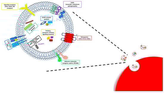 The bilayer presents a lipidic part composed of sphingomyelin, cholesterol, phosphatidylserine, ceramide, and a protein fraction. In particular, the proteins expressed on the exosome membrane are responsible for the selection of target cells and the exosome uptake [20]. Different proteins are distributed inside and on the membrane surface of exosomes; some among them are specific types of exosomes and characteristics of the origin cells and tissues, while others are nonspecific types of exosome proteins present in all exosomes, regardless of the origin tissues. Specific types of exosome proteins are adhesion molecules (integrins, ephrin, and, mostly, the epithelial cell adhesion molecule—EPCAM), specific tetraspanins (CD9, CD63, and CD81), major histocompatibility complex (MHC) I and II class molecules and growth factors [19], and also heat shock, cytoskeleton, apoptotic, and cell signaling proteins. Nonspecific types of exosome proteins are, instead, components of the exosome biogenesis process, such as Rab GTPases (Rab2 and Rab7), ALIX, and flotillin [19].