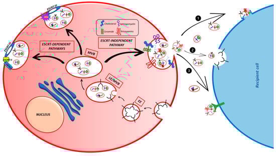 Principal mechanisms of exosome formation in cells. The figure illustrates the ESCRT-dependent and -independent pathways involved in exosome formation and the three ways used by exosomes to enter the target cells. (1) Direct fusion with the plasma membrane; (2) endocytosis; (3) direct interaction with plasma membrane receptors.