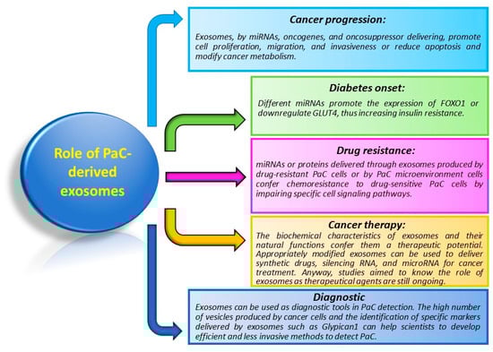 The role of exosomes in PaC is not quite different from exosomes acting in other cancers. As such, they alter and control cancer progression by influencing proliferation, migration, invasion, immunoregulation, and chemoresistance, both at local and systemic levels. As in other cancers, exosomes are used in the diagnosis and prognosis of PaC. Moreover, they play an exclusive role in the pathogenesis of diabetes.