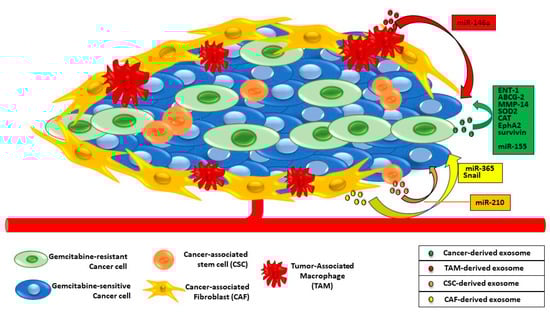 Because of the vesicular trafficking, there is an exchange of promoting chemoresistance factors between drug-resistant and drug-sensitive cells but also between cancer and microenvironment cells. One of the most basic mechanisms by which exosomes are actively involved in chemoresistance is the removal of gemcitabine from PaC cells and their microenvironment.