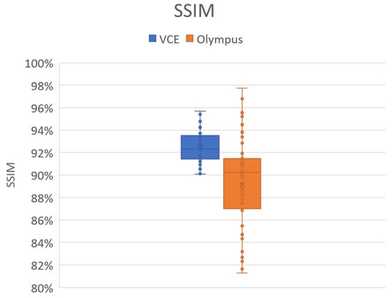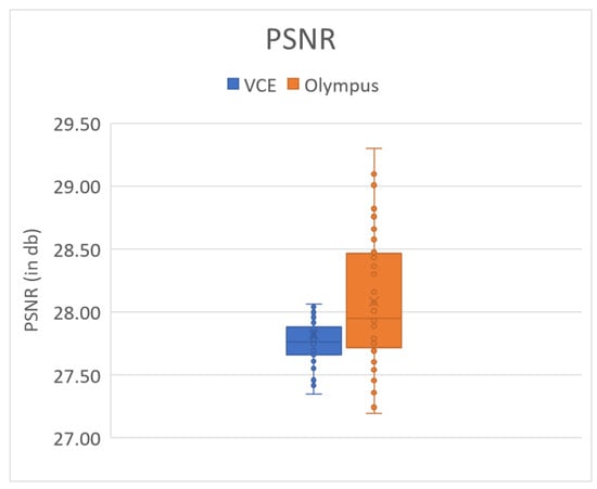 PSNR is a byte-by-byte comparison of the quality of two images [48,49]. It is one of the simplest methods to compare the source and the reproduced image [50]. PSNR is analyzed similar to SSIM. The corresponding WLI images from VCE and the Olympus endoscope were separately compared with the simulated NBI images. PSRN values range between 20 and 60 dB, and the higher the value is, the better the result. For an 8-bit data representation, the accepted PSNR value is about 25 dB [51].