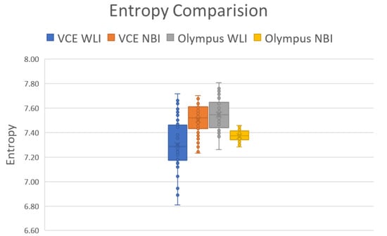 The second criterion employed to assess the algorithm formulated in this investigation was entropy [46]. The calculation of entropy was similar to that of SSIM. The entropy discrepancy between the WLI images acquired through the Olympus endoscope and the simulated NBI images was compared. Entropy can be utilized in image processing for the purpose of texture classification. A specific texture may exhibit a distinct entropy value because certain patterns tend to recur in a relatively consistent manner [47]. Within the framework of the paper, low entropy is indicative of reduced disorder and diminished variance among the constituent elements. Thus, reducing the entropy results in an improved reproduction of the image. The entropy disparity between the WLI images acquired through VCE and the simulated NBI images was compared.