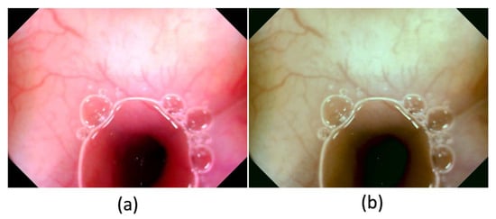 Comparison between WLI and simulated NBI images of VCE. (a) WLI image from VCE, (b) simulated NBI image from the NBI conversion algorithm.