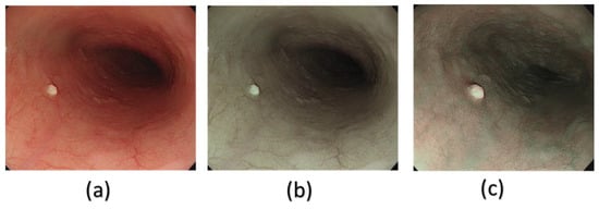 Specific cancers, such as esophageal EC, which does not have any particular biomarker in early stages, can be diagnosed early with the use of NBI [21,25]. Many previous studies have proven that the accuracy, sensitivity, and specificity of early detection of various types of cancer increased significantly with the use of NBI [26,27,28,29,30,31]. Tsai et al. used single-shot detector and hyperspectral imaging to detect early EC and revealed that the overall accuracy of the NBI images was 91% and the RGB image’s accuracy was only 88% [32]. Lee et al. examined EC by using the conventional white light imaging (WLI) and NBI, and concluded that NBI was much more effective than the conventional WLI in detecting dysplasia [33]. Yosidha et al. demonstrated that the NBI system improved the accuracy of magnifying endoscopy [34]. Hence, the use of NBI is critical in VCE to detect early EC.