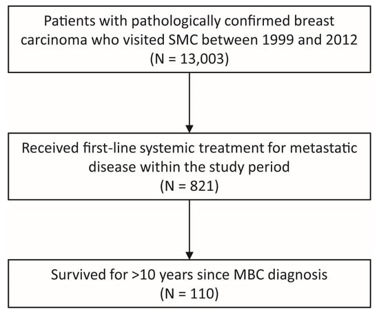 We identified all consecutive patients who (1) were diagnosed with pathologically confirmed breast carcinoma of stage IV according to the seventh edition of the American Joint Committee on Cancer staging manual between 1999 and 2012, (2) received at least one systemic treatment for metastatic disease, and (3) survived for longer than ten years since MBC diagnosis from the clinical data warehouse in Samsung Medical Center. Patients with stage I, II, or III breast cancer treated with curative intent and subsequently developed metastatic disease (i.e., recurrent MBC) were also included in the study. We obtained data regarding clinicopathologic characteristics, neoadjuvant and adjuvant treatments, breast cancer surgery, and local and systemic therapy for metastatic disease from the electronic medical records. The date of last survival follow-up or death was determined using the national health insurance database, which provides real-time information on the death status of virtually all domestic Korean citizens. To minimize information bias, the survival data of all patients still alive on 28 April 2023 were censored.