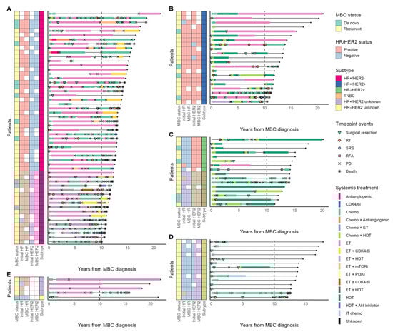 The clinical course of individual patients in the HR+/HER2− (A), HR+/HER2+ (B), HR−/HER2+ (C), TNBC (D), and HER2-unknown (E) subgroups. Empty boxes in the HR and HER2 status columns indicate missing information. The horizontal solid lines indicate the period of survival follow-up for each patient. Patients without the death symbol on the right end of the line were alive at the time of data cutoff. MBC, metastatic breast cancer; HR, hormone receptor; HER2, human epidermal growth factor receptor 2; TNBC, triple-negative breast cancer; RT, radiation therapy; SRS, stereotactic radiosurgery; RFA, radiofrequency ablation; PD, progressive disease; CDK4/6i, cyclin-dependent kinase 4 and 6 inhibitor; chemo, chemotherapy; ET, endocrine therapy; HDT, HER2-directed therapy; mTORi, mammalian target of rapamycin inhibitor; PI3Ki, phosphoinositide 3-kinase inhibitor; IT chemo, intrathecal chemotherapy.
