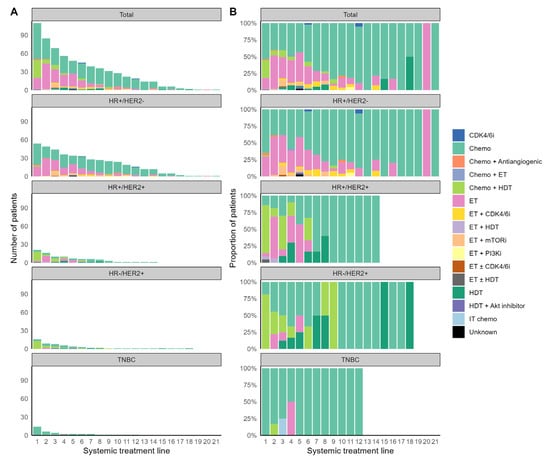Cytotoxic chemotherapy alone was the most common first-line treatment for both HR+/HER2− and TNBC subgroups, with 35 (64.8%) and 14 (100%) patients receiving it as initial treatment, respectively, whereas 15 (71.4%) patients with HR+/HER2+ MBC and 13 (81.2%) patients with HR−/HER2+ MBC received a frontline combination of chemotherapy and HER2-directed therapy (Figure 3B). All except one patient with HR+/HER2− MBC received at least one ET for metastatic disease, and 16 (29.6%) of them received it in the first line. An HR+/HER2− patient who did not receive any ET had left cerebellum and lung metastases at the initial recurrence of breast cancer, underwent surgical tumor removal followed by stereotactic radiosurgery (SRS) for the brain metastasis, and then received sequential lines of chemotherapy with docetaxel (for 3 months) and capecitabine (for 44 months). After two additional SRS and whole-brain radiation therapy to control the intracranial disease progression, the patient remained treatment-free and alive for approximately nine years. While systemic treatments used for the HR+/HER2− MBC were primarily ET alone or combined with targeted agents, 17 HR+/HER2− patients received more chemotherapy than ET in terms of treatment duration (Supplementary Figure S1). We found that patients with HR+ MBC with HER2 IHC score of 0 (HR+/HER2−zero) received more ET than chemotherapy compared to patients with HR+ MBC with HER2 IHC scores of 1 or 2 (HR+/HER2−low; p = 0.011; Supplementary Table S2). Fourteen (66.6%) patients with HR+/HER2+ MBC also received ET, mostly in the second or later line. Among them, ten patients received ET for longer than HER2-directed therapy with or without chemotherapy (Figure 2).
