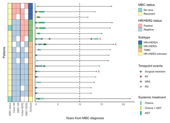 The clinical course of patients who received systemic treatment for less than two years throughout the follow-up period. Patients denoted with a red ‘B’ symbol at the right end of the horizontal line had brain metastasis at diagnosis of MBC. Abbreviations are as in Figure 2.