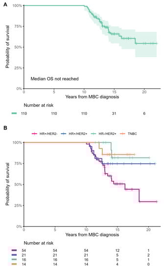 After a median follow-up of 14.6 years, 34 (30.9%) patients died. The median OS was not reached in the LTS (Figure 5A), HR+/HER2+, HR−/HER2+, and TNBC cohorts, while it was 16.2 years in the HR+/HER2− cohort (Figure 5B). After the 10-year landmark, patients with HER2+ MBC had significantly longer OS than patients with HR+/HER2− MBC (HR, 0.37; 95% CI, 0.16–0.86, p = 0.021). Visual inspection of survival curves also showed a trend toward longer OS of the TNBC subgroup compared to the HR+/HER2− subgroup, but this did not reach statistical significance due to the small number of patients with TNBC (HR, 0.27; 95% CI, 0.06–1.14, p = 0.075). After around 13 years from MBC diagnosis, the Kaplan–Meier survival curves for HR+/HER2+, HR−/HER2+, and TNBC subgroups reached a plateau, indicating the potential for cure in these subtypes. However, this was not observed in the HR+/HER2− subgroup (Figure 5B).