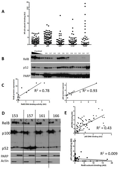 Expression of NF-kB subunits in CLL. Nuclear extracts prepared from selected CLL cases were examined using both ELISA and Western blotting. The scattergram (A) shows DNA binding levels of NF-κB p65 and p50 subunits (n = 80) and p52, c-Rel, and RelB subunits (n = 52) as measured using ELISA (arbitrary units AU, see methods). (B) Western blotting confirmed the heterogeneity in RelB and p52 expression in CLL cases. Nuclear extracts prepared from IR-treated MDA-MB-231 cells containing increasing amounts of protein (5, 10, 20 μg) were used as controls for increasing subunit expression and PARP was used as a loading control. (C) For both RelB and p52 there was a strong correlation between DNA binding activity and protein expression. (D) Expression of RelB, p100, and p52 in cytoplasmic and nuclear fractions prepared from cells from 4 CLL cases. (E) Correlation between p65 and p50 subunits in CLL samples (n = 80), and lack of correlation between p52 and RelB (n = 52).