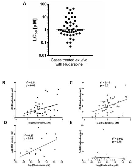Ex vivo chemoresistance is significantly associated with high p65, p50, and p52 activity but not RelB. Cells from CLL cases were treated with fludarabine for 48 h and viability was assessed using the XTT assay. The LC50 values (concentration of drug that reduced viability to 50% of solvent controls) were calculated and are summarised in (A). LC50 values from fludarabine-treated cells were analysed to study relationships with p65 (B), p50 (C), p52 (D), and RelB (E).