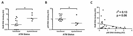 Increased activity of RelB in ATM dysfunctional cases. (A) Cases with ATM dysfunction tended to have higher RelB DNA binding levels than those with functional ATM; (B) ATM dysfunctional cases had significantly lower levels of p65; (C) RelB and p65 DNA binding levels showed an inverse relationship, suggesting that high levels of the RelB subunit tend to be associated with low levels of the p65 subunit. * denotes p value of < 0.05.
