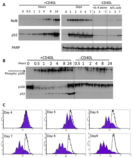 RelB and p52 are activated following CD40L-induced stimulation. (A) Nuclear extracts were prepared from CLL cells at specific times following co-culture on CD40L-expressing cells (n = 6, representative example shown). CLL cells with IL-4 alone, or cells lacking CD40L expression were used as controls. (B) Phosphorylation of cytoplasmic p100 was measured over 0.5 to 24 h after CD40 stimulation (and compared to the control (“—CD40L” conditions). (C) CLL cells were stained with CFSE and co-cultured (+10 ng/mL interleukin 4) on CD40L-expressing fibroblast cells or on the non-CD40L-expressing (NTL) cells (both of which had been growth-arrested with 75 Gy IR). Cell samples were removed daily and quantification of CFSE in CD19+ve CLL cells (flow cytometry), shows CLL cell proliferation (seen by sub-peaks of CFSE fluorescence) that continued throughout the period studied. CLL cells cultured on the non-CD40L-expressing cells (shown by overlaying black lines) have no CFSE sub-peaks (histograms from one case representative of 5 others).