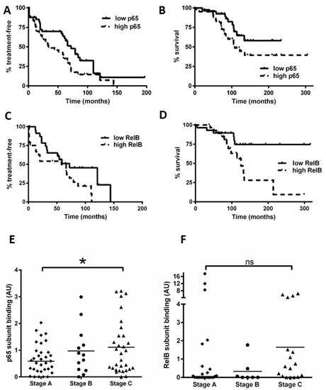 High levels of nuclear RelB activity are associated with shorter time to treatment and poorer survival in CLL. Kaplan–Meier analysis was used to examine p65 and RelB activity in relation to time from diagnosis to first treatment and overall survival (OS); cases were stratified according to whether their DNA binding levels for p65 were higher or lower than the median level. (A) p65 in relation to time to treatment or to OS (B). RelB subunit DNA binding activity in relation to (C) TTT or (D) OS. Cases were then segregated according to the Binet stage at the time of sample collection, and p65 DNA binding activity for Binet B and C cases (n = 47) was compared to that for stage A cases (n = 33) (E). Similarly, RelB was compared according to Binet stage (F) (solid line on scatter plot shows median value). * denotes a p value of <0.05. (ns = not significant).