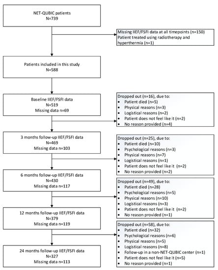The flow diagram of the study is presented in Figure 1. Of the 739 patients participating in NET-QUBIC, 588 were included in the current study (79.5%) (Figure 1).