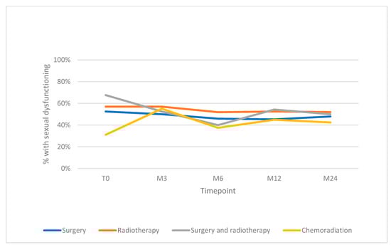 In the group treated with chemoradiation with or without surgery, the percentage of patients with sexual dysfunction increased after treatment to 3 months after treatment up to the level of the other groups; the percentages in these groups remained stable (single treatment by surgery or radiotherapy) or decreased (surgery and radiotherapy) at 3 months after treatment compared to baseline. From 3 to 6 months after treatment, the percentage of patients with sexual dysfunction decreased in all groups but the most in the groups treated by multimodal treatment (surgery and radiotherapy, and chemoradiation with or without surgery). From 6 to 12 months there was an increase in the percentage of patients with sexual dysfunction in the multimodal treatment groups. From 12–24 months, percentages of patients with sexual dysfunction remained more or less stable over time in all groups.