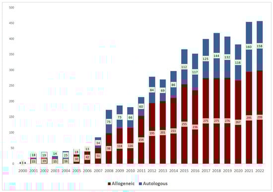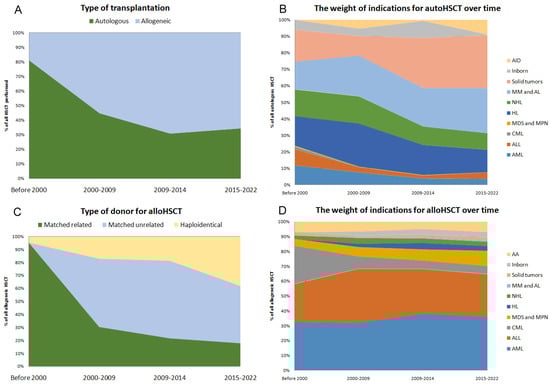 The indications for transplantation have also changed. Before 2010, the indications for autoHCT were evenly distributed among acute leukemias, Hodgkin’s lymphoma (HL), non-Hodgkin’s lymphomas (NHL), multiple myeloma (MM) and solid tumors (ST); in recent years, solid tumors in children and MM in adults constituted the majority of autoHCT indications. In the early years, patients with solid tumors were autografted for breast, testicular cancer and germline tumors, while in the later years, it was solely pediatric tumors. The proportion of NHL, HL and, especially, acute leukemia in the structure of indications for autoHCT has been decreasing over the years. On the other hand, there was an expansion of the transplantation program for autoimmune diseases (AID) in recent years, the share of which became 9% in the structure of indications (Figure 2B).