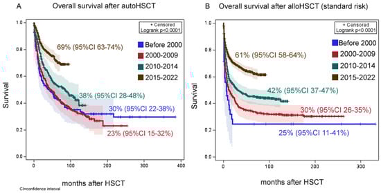 Thirty-year overall survival (OS) in the whole group of autoHCT and alloHCT first transplants in a hematological response was 42% (95% confidence interval [CI] 39–47%), event-free survival (ES)—35% (95% CI 31–40%). Thirty-year OS after autoHCT was 40% (95% CI 33–47%), EFS—34% (95% CI 23–37%). After alloHCT, the overall thirty-year survival was 50% (95% CI 46–54%), event-free—43% (95% CI 39–47%). In both types of HCT, there was a progressive improvement in patient survival. After standard-risk autoHCT, OS was 23% (95% CI 15–32%) before 2000, 30% (95% CI 22–38%) during 2000–2009, 38% (95% CI 28–48%) during 2010–2014 and 69% (95% CI 63–74%) during 2015–2022 (p < 0.0001, Figure 3A). After standard-risk alloHCT, OS was 20% (95% CI 9–33%) before 2000, 24% (95% CI 20–28%) during 2000–2009, 34% (95% CI 30–48%) during 2010–2014 and 56% (95% CI 52–59%) during 2015–2022 (p < 0.0001, Figure 3B).