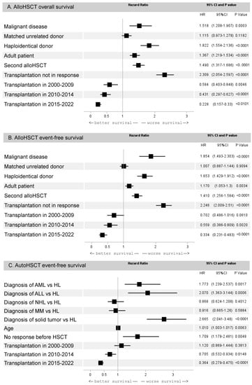 Forest plot with results of multivariate analysis. (A) Influence of factors on overall survival after alloHCT. (B) Influence of factors on event-free survival after alloHCT. (C) Influence of factors on event-free survival after autoHCT.