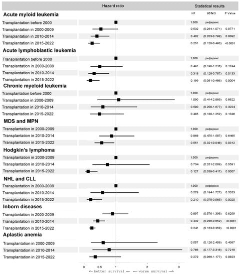 In AML after alloHCT, there is a progressive improvement in survival, with the best rates in the last five years (HR 0.3, 95% CI 0.1–0.5, p < 0.0001). In ALL, a similar trend in improved survival was observed (HR 0.2, 95% CI 0.1–0.5, p = 0.0004). In aplastic anemia (AA), the OS after alloHCT from matched related and unrelated donors improved significantly (HR 0.3, 95% CI 0.2–0.8, p = 0.0152), mainly due to progress in unrelated donor HCT. However, due to the moderate outcomes of haploidentical HCT in heavily pretreated AA patients in the last 5 years, the OS in the entire AA cohort did not change significantly (HR 0.3, 95% CI 0.1–1.2, p = 0.08). In chronic myeloid leukemia (CML), there was no improvement in transplant outcomes over time (HR 0.5, 95% CI 0.2–1.3, p = 0.13). Some improvement in the results of alloHCT was observed in myelodysplastic syndrome (MDS) and chronic myeloproliferative neoplasms (MPN) but only in the last five years (HR 0.6, 95% CI 0.3–0.9, p = 0.03). A dramatic improvement in OS was observed with alloHCT in HL (HR 0.1, 95% CI 0.0–0.4, p = 0.0007), NHL and chronic lymphocytic leukemia (CLL) (HR 0.2, 95% CI 0.0–0.6, p = 0.0020). The same pattern was observed in inborn diseases (ID) (HR 0.2, 95% CI 0.2–0.4, p < 0.0001) (Figure 5). The best results of alloHCT in the last five years were observed in HL (OS 84%), NHL and CLL (OS 86%), AA (OS 85%) and ID (OS 87%).