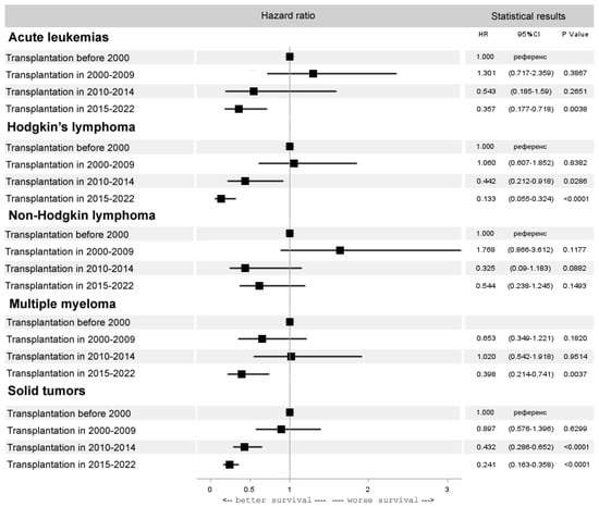Interestingly, despite a significant decrease in the number of autoHCTs in acute leukemia, there was an improvement in the results of HCT, reflecting the current practice of autoHCT in molecular remissions (HR 0.4, 95% CI 0.2–0.7, p = 0.0038). The autoHCT results also improved in HL (HR 0.1, 95% CI 0.1–0.3, p < 0.0001), multiple myeloma (HR 0.4, 95% CI 0.2–0.7, p = 0.0037) and solid tumors (HR 0.2, 95% CI 0.2–0.4, p < 0.0001). In NHL there were no significant improvements in the results for autoHCT (HR 0.5, 95% CI 0.3–1.2, p = 0.15) (Figure 6).