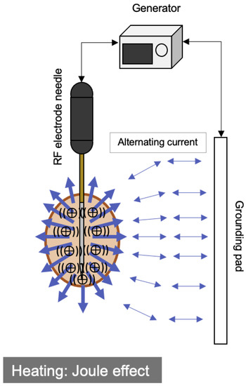 RFA is a current loop comprising a generator, cabling, electrodes, and the grounding pad (Figure 1). An electrical current of ~450–500 kHz causes the ions inside the tissue to rapidly oscillate, resulting in resistive tissue heating around the active electrode, which is known as the Joule effect [1]. This induces local temperatures of between 60 and 100 °C (Table 1).