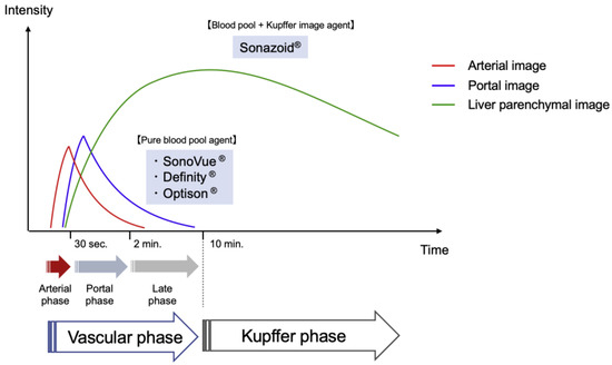 Pharmacokinetic behaviors of US contrast agents. The vascular phase shows tumor vascularity. The artery- and portal-dominant time zones in the vascular phase are referred to as the arterial and portal phases, respectively, while the Kupffer phase (from 10 min after the injection of Sonazoid®) shows hepatic parenchymal findings.