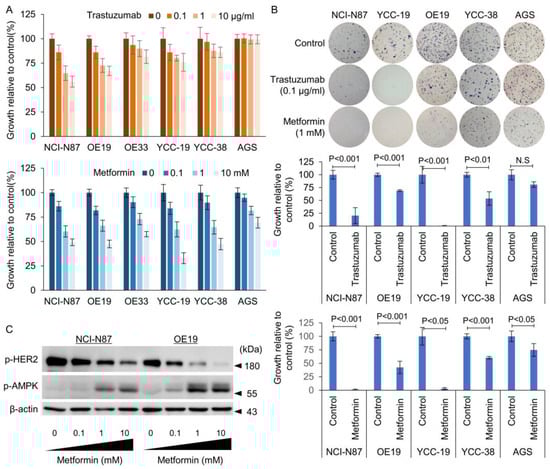 Kim, J.-S.; Kim, M.Y.; Hong, S. Synergistic Effects of Metformin and Trastuzumab on HER2 Positive Gastroesophageal Adenocarcinoma Cells In Vitro and In Vivo. Cancers 2023, 15, 4768. https://doi.org/10.3390/cancers15194768