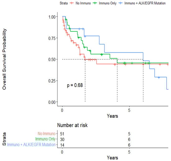The median survival from the start of treatment administration was 3.55 (95% CI: 1.70-NA) years (Figure 1). When stratified, the median survival was 6.01 (95% CI: 2.75-NA) years for patients who had immunotherapy for their NSCLC and an ALK or EGFR mutation that required targeted therapy in the form of TKIs and mAbs. On the other hand, the median survival from the start of treatment administration was 4.08 (95% CI: 1.59-NA) years for patients who had immunotherapy for their NSCLC but not ALK or EGFR mutation-related targeted therapy, and 1.70 (95% CI: 1.30-NA) years for patients who did not have immunotherapy or ALK or EGFR mutation-related targeted therapy (Figure 2). These levels were not statistically significant from each other, however.