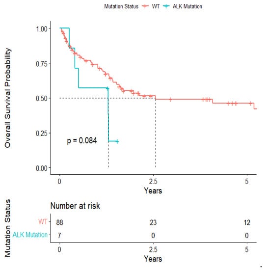 Kaplan–Meier survival curve of ALK-rearranged mutational status predicting overall survival.
