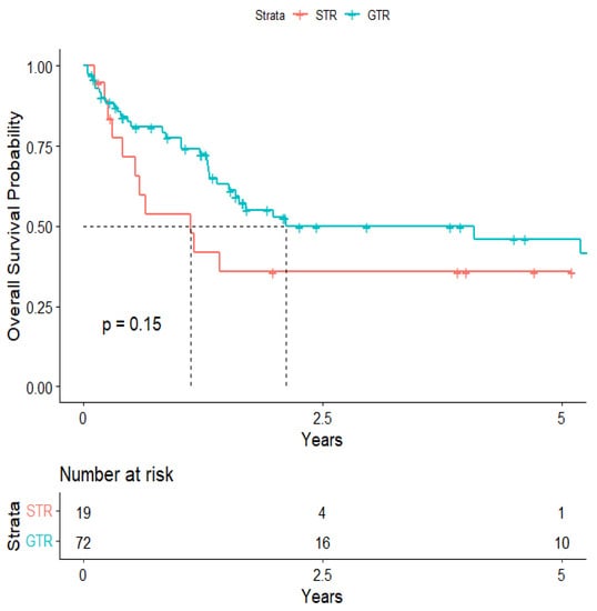 Kaplan–Meier curve of extent of resection from 1st craniotomy predicting overall survival.