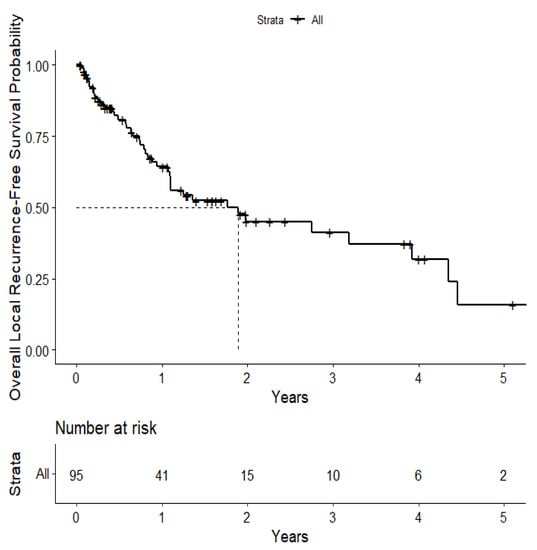 The overall median survival was 2.12 years (Figure 3). The median survival for patients with ALK-rearranged mutations was 1.29 years (Figure 4), and the median survival for patients with EGFR-amplified mutations was 5.19 years (Figure 5). Additionally, the median survival for patients with GTR was 2.12 years (Figure 6). Furthermore, the overall LRFS was 1.89 years (Figure 7). Median LRFS could not be calculated for ALK patients due to limited sample size (Figure 8). The median LRFS for EGFR patients was 4.35 years (Figure 9). The median LRFS for patients with GTR was 1.76 years (Figure 10).