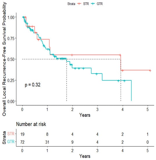 Kaplan–Meier curve of extent of resection from 1st craniotomy predicting local recurrence-free survival.