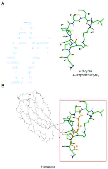 Three-dimensional structure of uPAcyclin. (A) Lowest energy conformer of uPAcyclin calculated using the NMR constraint reported in Table S2 through a simulated annealing procedure followed by molecular minimization. Heavy atoms are shown in different colors (carbon, grey or green; nitrogen, blue; oxygen, red; hydrogen, white). For the sake of clarity, only polar hydrogen atoms are depicted. (B) Superposition of the NMR structure of uPAcyclin and the crystal structure of fibronectin (pdb code 4MMX) [39]. The structures of uPAcyclin (same color codes as in (A)) and fibronectin (grey, only the RGD fragment is shown in orange) were superimposed using the heavy atoms in the following couples of side chains: Lys1/Arg and Glu8/Asp. For the sake of clarity, uPAcyclin and the RGD region of fibronectin (in the red box) are 10× enlarged compared to the remaining part of the protein.