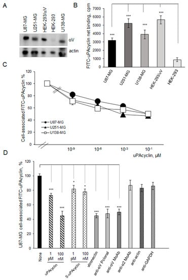 αV expression of U87-MG, U251-MG, and U138-MG GBM cells and specific binding of FITC-uPAcyclin. (A) U87-MG, U251-MG, U138-MG, HEK-293, and HEK-293/αV total cell lysates were subjected to Western blotting and probed using polyclonal anti-αV or polyclonal anti-actin as loading control. (B) A total of 2 × 106 U87-MG, U251-MG, U138-MG, HEK-293/αV, or HEK-293 cells were pre-incubated for 30 min at 4 °C with 500 nM uPAcyclin and further exposed to 50 nM FITC-uPAcyclin for 2 h at 4 °C. At the end of the incubation, the unbound material was washed and cell-associated FITC-uPAcyclin was quantitated by a fluorimeter. The net value of cell-surface-associated fluorescence, corresponding to the specific binding, is shown. (C) A total of 2 × 106 U87-MG, U251-MG, and U138-MG cells were pre-incubated for 30 min at 4 °C with increasing concentrations of unlabeled uPAcyclin and then assayed for binding of FITC-uPAcyclin, for 2 h at 4 °C. Cell-surface-associated fluorescence, as percentage of the samples without FITC-uPAcyclin, is shown. (D) U87-MG cells were pre-incubated with uPAcyclin (1 pM, 100 nM), scrambled uPAcyclin (S-uPAcyclin, 1 pM and 100 nM)), vitronectin (200 µM), anti-αv polyclonal (anti-αV Pclonal, 5 µg/mL) or monoclonal (anti-αV MoAb, 5 µg/mL) or anti-α2 monoclonal (anti-α2 MoAb, 1 µg/mL), polyclonal anti-actin, and monoclonal anti GAPDH. Then, cells were treated as in B (* p-value < 0.05; *** p-value < 0.001).