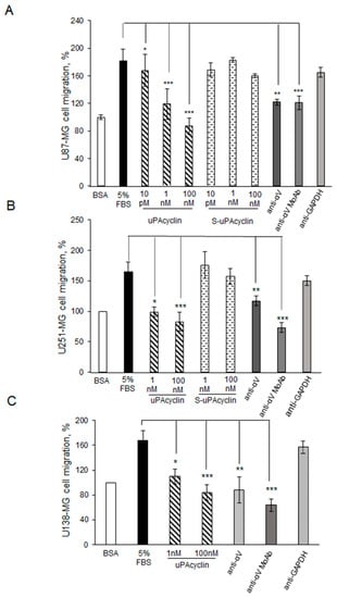 Belli et al. [25] showed that the uPAcyclin peptide is a potent inhibitor of migration and invasion of breast cancer cell lines. Here, the αV-dependent inhibition of GBM cell migration was investigated by chemotactic assays in Boyden chamber devices in the presence of pico- and nanomolar concentrations of uPAcyclin. Unlike the S-uPAcyclin that is ineffective, 1 nM uPAcyclin caused a 70–80% inhibition of U87-MG, U251-MG, and U138-MG GBM cell migration, and 100 nM reduced migration to below background levels (Figure 3A–C).