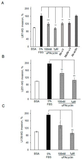 Similar experiments were conducted to test cell invasion, following incubation of U87-MG, U251-MG, or U138-MG cells with 100 nM or 1 µM uPAcyclin or diluents, and allowing cells to invade in Boyden chambers for 5 h, in the presence of Matrigel. The assay was carried out in the presence of 5% FBS as a chemoattractant (Figure 4).