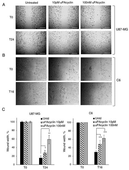 Wound healing assay of U87-MG and C6 cells, in the presence of uPAcyclin. (A) U87-MG cells were grown to confluence in multiwell-12 plates with inserts, pre-incubated with uPAcyclin (10 pM or 100 nM) or diluents for 40 min at 37 °C, and then exposed to 3% FBS, in the presence of uPAcyclin or diluents, as reported [25]. Images were taken at time 0 (T0) and 24 h (T24) and representative images are shown (50× total magnification, scale bar: 250 µm). (B) C6 cells were grown to confluence in multiwell-12 plates, wounded with a yellow tip, pre-incubated with uPAcyclin (10 pM and 100 nM) or diluents, and assayed as in panel A. Representative images of wound closure were taken at time 0 (T0) and 16 h (T16) (40× total magnification, scale bar: 100 µm). (C) For both U87-MG and C6, the wound width at time 0 is taken as 100% and the wound width at T24 or T16 is calculated as relative to that (* p-value < 0.05; ** p-value < 0.005; *** p-value < 0.001).