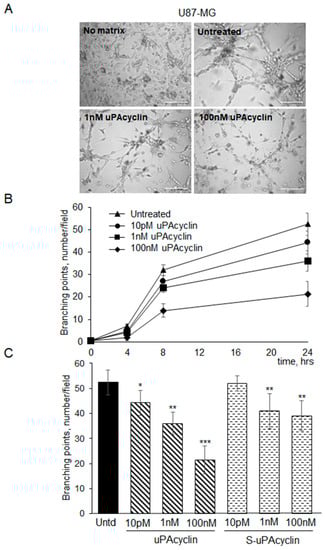 Vascular mimicry formation by U87-MG and effect of uPAcyclin. (A) Representative images of U87-MG cells pre-treated or not (untreated) for 40 min at 37 °C with uPAcyclin (1 nM and 100 nM) and then plated onto GeltrexTM in multiwell-96 (3 × 104/well). As a control, cells were grown in the presence of DMEM/10% FBS (No matrix) or with GeltrexTM (Untreated, Untd). Images are taken at 24 h using the Inverted Microscope DMI Leica 6000 with 50× total magnification, scale bar: 75 µm. (B) The quantitation of branching points, defined as the intersection of at least three tubes [24], was performed at 4, 8, and 24 h either in control cells and cells pre-treated for 40 min at 37 °C with 10 pM, 1 nM, and 100 nM uPAcyclin before plating onto GeltrexTM. (C) U87-MG cells were pre-treated with uPAcyclin or with S-uPAcyclin, at the indicated concentrations, plated onto GeltrexTM and, 24 h later, the number of branching points was evaluated and reported in the histogram (* p-value < 0.05; ** p-value < 0.005; *** p-value < 0.001).
